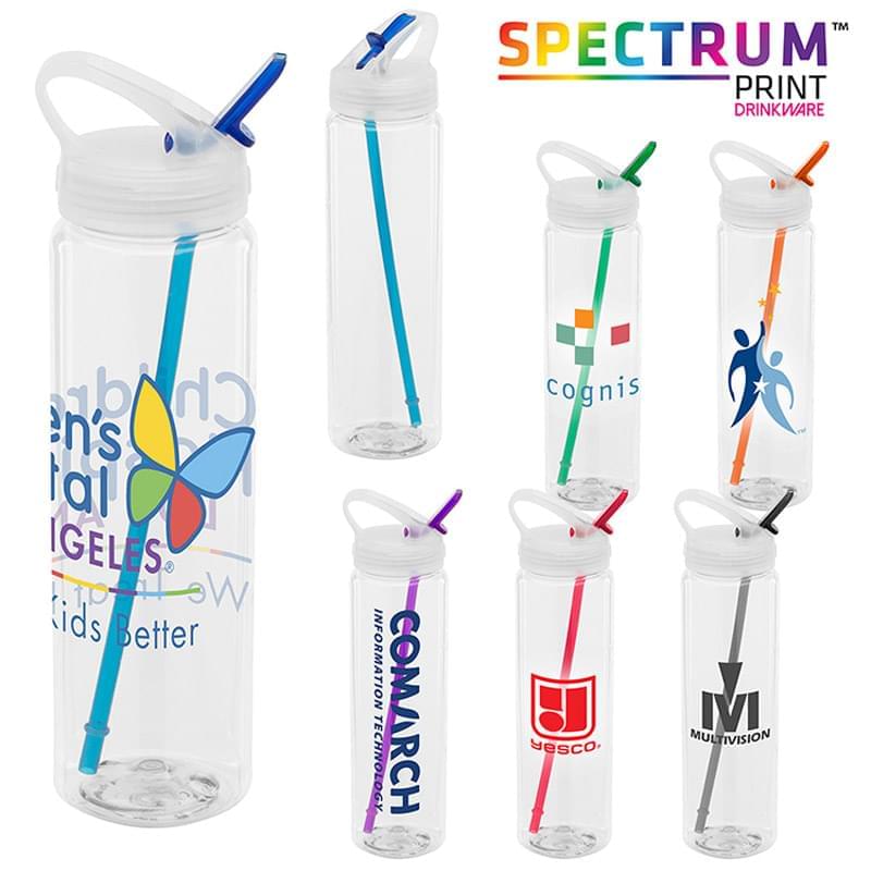 32 oz. Clear PET plastic water bottle. Frosted lid with accent color flip-up spout and color matched draw straw; built in sport loop for easy transport. Fits in most cup holders; recyclable; handwash recommended. Made in the USA. **Inventory available late January