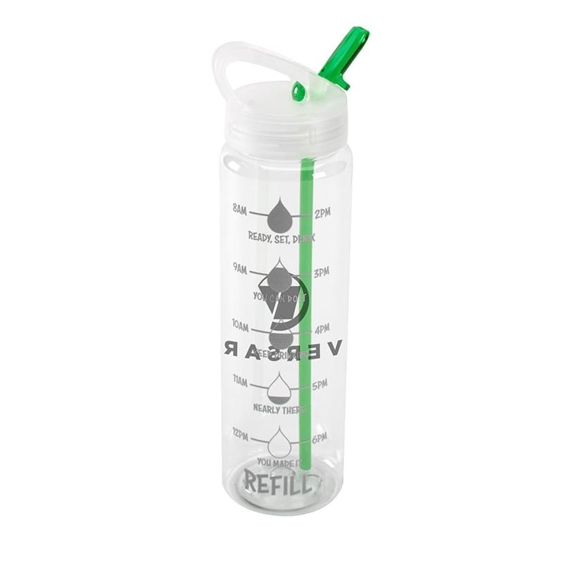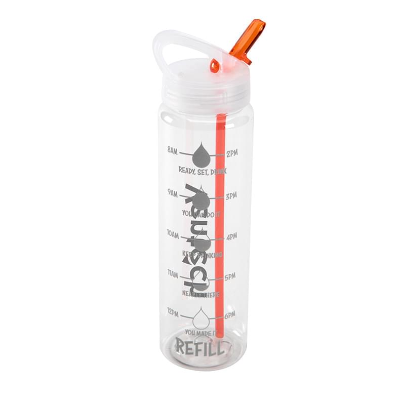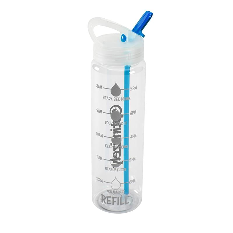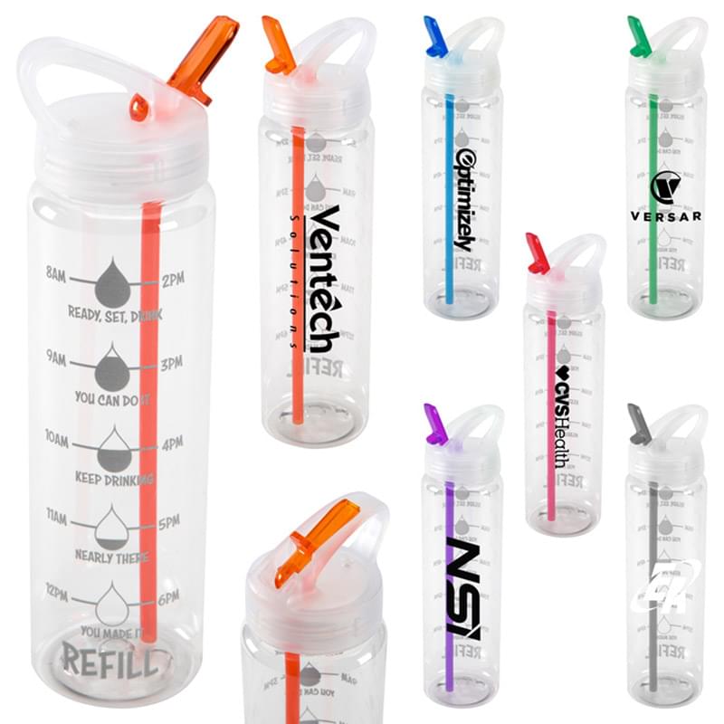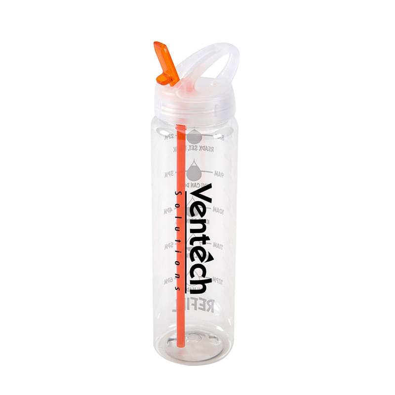 32 oz. Clear PET plastic water bottle. Frosted lid with accent color flip-up spout and color-matched draw straw; built-in sport loop for easy transport. Hydration mark for beverage measurement. Fits in most cup holders; recyclable; handwash recommended. Made in the USA.