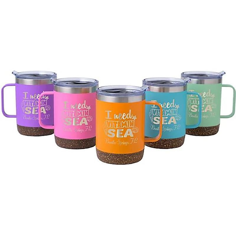 • 12 oz. double-wall powder coated stainless steel with faux cork base to protect surfaces from heat and scratches