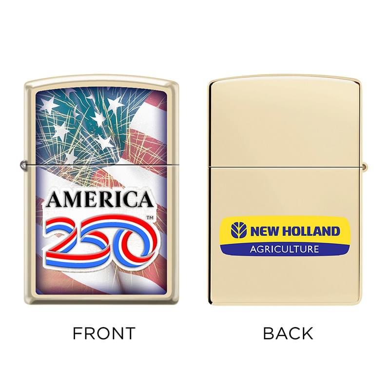 On July 4, 2026, our nation commemorates the 250th anniversary of the founding of the United States. ZIPPO & America250 have joined together in celebration! This special edition Champagne high polish finish lighter features an officially licensed America250 design. Add your logo to the back of this lighter with precision laser engraving or vibrant full-color printing. Backed by Zippo’s Lifetime Guarantee. Made in USA. Packaged in a gift box. Lighter fluid not included due to shipping restrictions.