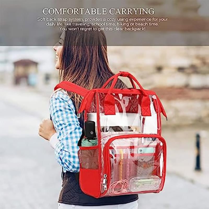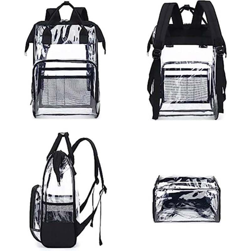 Introducing our premium heavy duty 30C Clear PVC Large Multiple Compartment Stadium Approved Backpack - the perfect combination of style, quality and security! Made with high-quality PVC, this backpack is designed to be durable and long-lasting. A flexible and wrinkle-free material, perfect for creating smooth and transparent protective bag. Its clear PVC lining and fully transparent design make it perfect for school, college, office, events and places with strict security regulations. Featuring one big double zipper pocket, one front zipper pocket with one mesh compartment and 5 mesh slots, 2 tall side pockets of 1 stretchable mesh pocket, reinforced padded adjustable straps, and a top handle for easy carrying, this backpack is both pracical and comfortable. With a size 15.5"H X 10"L X 5"W, it offers ample space for your essentials, and the mesh side pocket adds an extra layer of convenience. Upgrade your accessory game with our Clear PVC Backpack