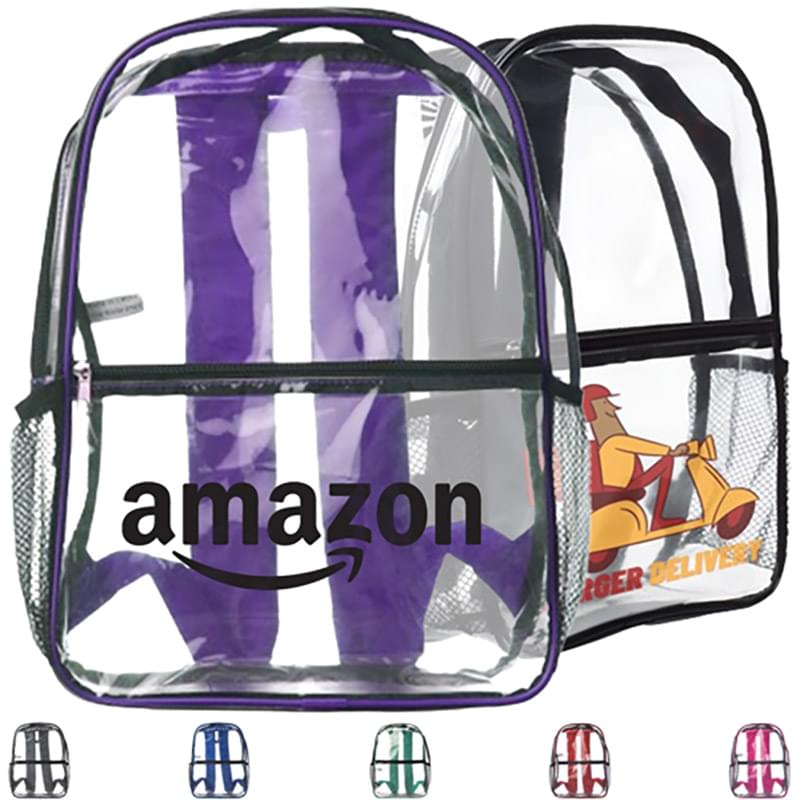 Heavy Duty PVC Transparent Backpack, Top Handle for Easy Grabbing, This sturdy clear backpack made of PVC with 25C thickness, 11"W X 15.50"H X 5"depth size and has plenty of room for everything you need for school and work. one substantial main compartment with two zippers for binders, laptops, books, etc.; There are two side mesh pouches for water bottles or folding umbrellas, or small items like tissues or keys, and one lower front single zipper bag for notepads, pens, towels, etc. You can bend it however you need because it is both strong and flexible, and even in cold weather, it won't break. To produce the ideal summer time gift for campers, hikers, and hunters, imprint with your brand!