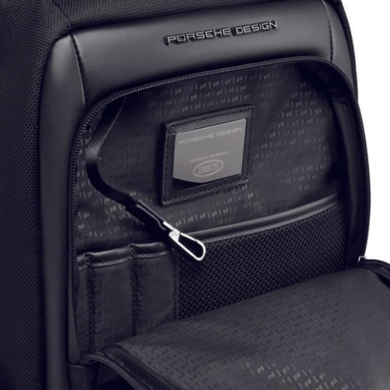 The BRIC'S® Porsche Design Nylon Roadster Large Backpack blends intelligent functionality with an exclusive, technical design. Crafted from water-repellent nylon with smooth leather accents, it features a large main compartment with a secure 15" laptop pocket accessible from the backside, offering enhanced protection. The front compartment includes a business organizer and USB plug-in, while hidden pockets and side compartments provide additional storage for valuables. With a padded back, adjustable shoulder straps, and a trolley sleeve, this backpack ensures both security and comfort during travel. Ideal for business professionals on the go.