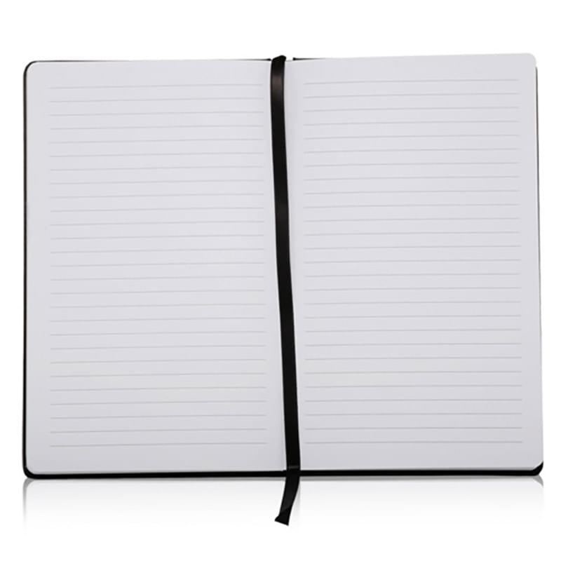 5.5 x 8.4 Hardcover Journals Notebooks w/ Corner Band! This handy promo measures 5.5W x 8.4H and feature a large imprint area of 3.25"W x 2.5"H ideal for maximum brand exposure. With Matching Color Top corner Elastic Band and 96 ruled pages, this two tone notepad is ideal for Office, schools, tradeshows, and giveaway events. Add your organization's name, logo and advertising message to create a promotional tool that you can count on!