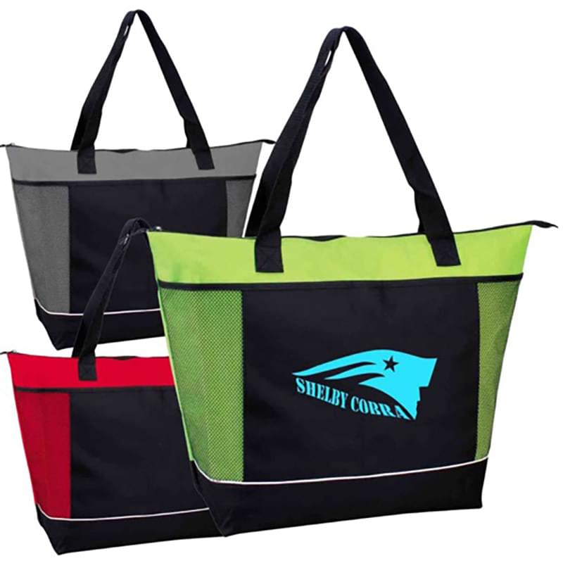 38-Can Insulated Jumbo Cooler Tote Bag, available on many colors. These jumbo, oversized cooler bag measures 22"W X 16"H X 7.5"D with 26" handle size and is made of 600D polyester with a 4mm EPE foam core and a PVC backing and lining material makes this insulated long lasting durable, easy to wash. Insulation keep your food fresh and warm. This cooler bag also features a large imprint area of 8" W x 6" H for screen print, perfect for maximum brand exposure. The PEVA lining is considered more eco-friendly and less toxic. 38 cans can fit in the main roomy compartment, which also has capacity for ice, silverware and has a One front pocket with velcro closure. To produce the ideal summer time gift for campers, hikers, and hunters, imprint with your brand.