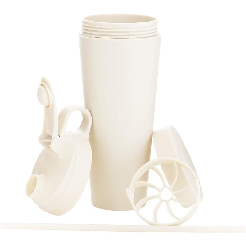 24 oz double wall polypropylene [BPA-free] multi-use shaker bottle with threaded snap-fit lid, threaded lid with straw, and shakr grate. Hand wash recommended. Do not microwave.