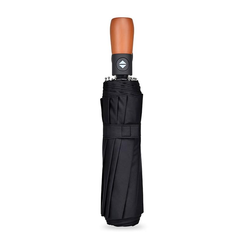 46" canopy diameter when opened. Canopy constructed of 10 panels and 10 ribs. Opens and closes automatically with the simple click of a button and conveniently folds for compact storage. Fiberglass frame is lightweight, yet durable. Wooden handle with wrist strap for convenient portability. Strap with hook and loop closure for easy, neat storage. Folds to 12.5" when closed. PFAS free and PVC Free Product.