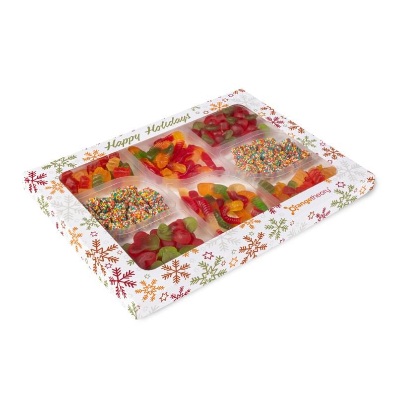 Gummy Charcuterie Tray, perfect for sharing or gift giving. Includes:5.65 oz. Gummy Cherries. 5.30 oz. Gummy Worms. 3.80 oz. Gummy Bears. 4.90 oz. Crispy Crunchy Gummy Bears. Fully Customizable, Full Color Die Cut Box. Product Video