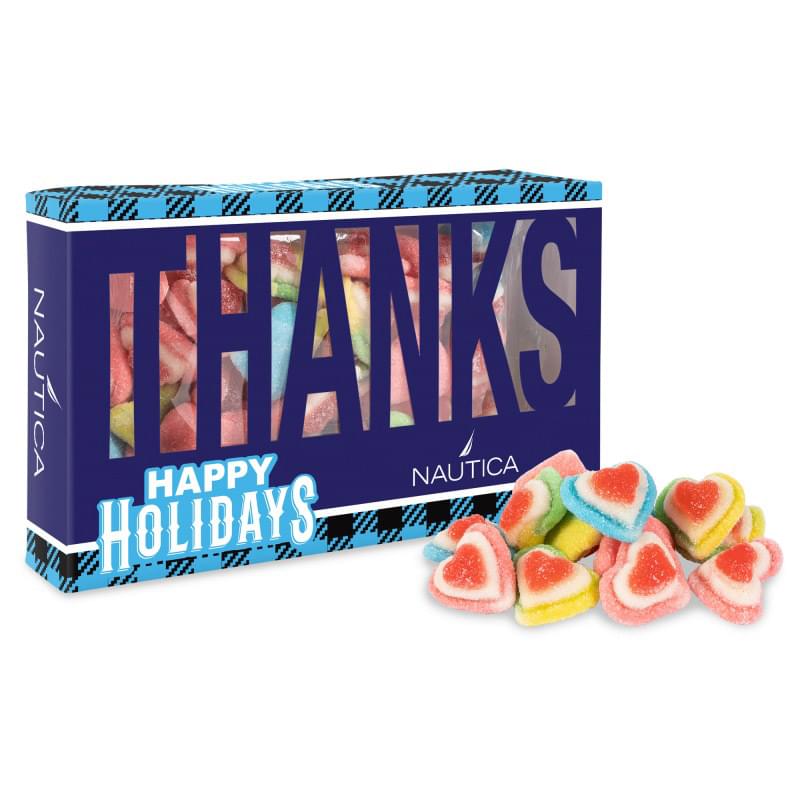 Full color die cut "word" box features a thanks die cut design. Add your logo to our stock design or fully customize box. Comes filled with delicious triple layer hearts. Perfect gift to say thanks to your employees or customers!