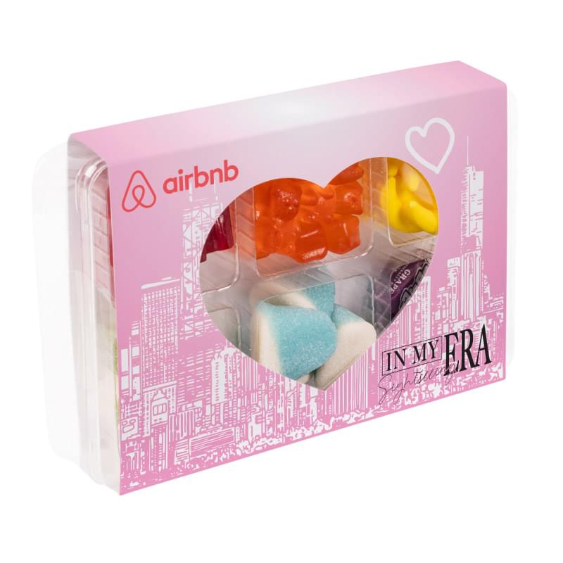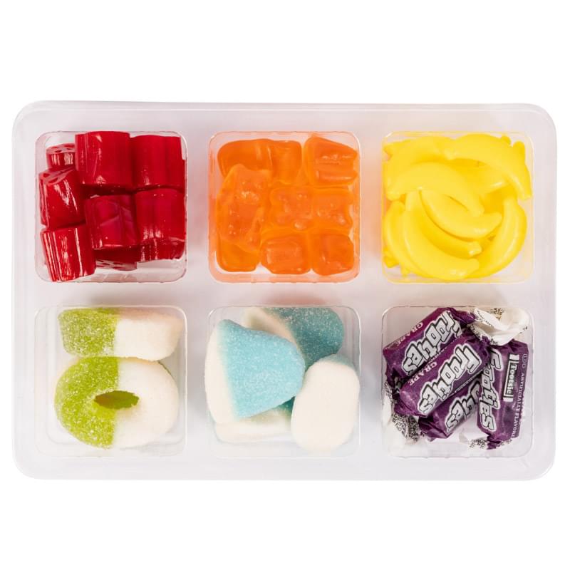Why choose a single candy, when you can have six?! Delight recipients with a heart die cut box, thoughtfully designed to satisfy any sweet tooth. Perfectly customizable ensuring your message looks as good as the candy tastes. Heart shaped die-cut box with nested candy cavities for premium presentation. Includes: Cherry Bites, Champagne Gummy Bears, Silly Bananas, Green Apple Rings, Blue Razz Puffy Puffs, and Grape Frooties. Fully Customizable or add your logo to stock art. Perfect for Valentines Day or Appreciation Gifts