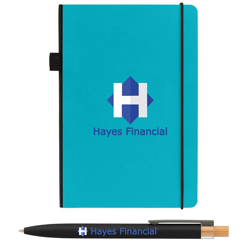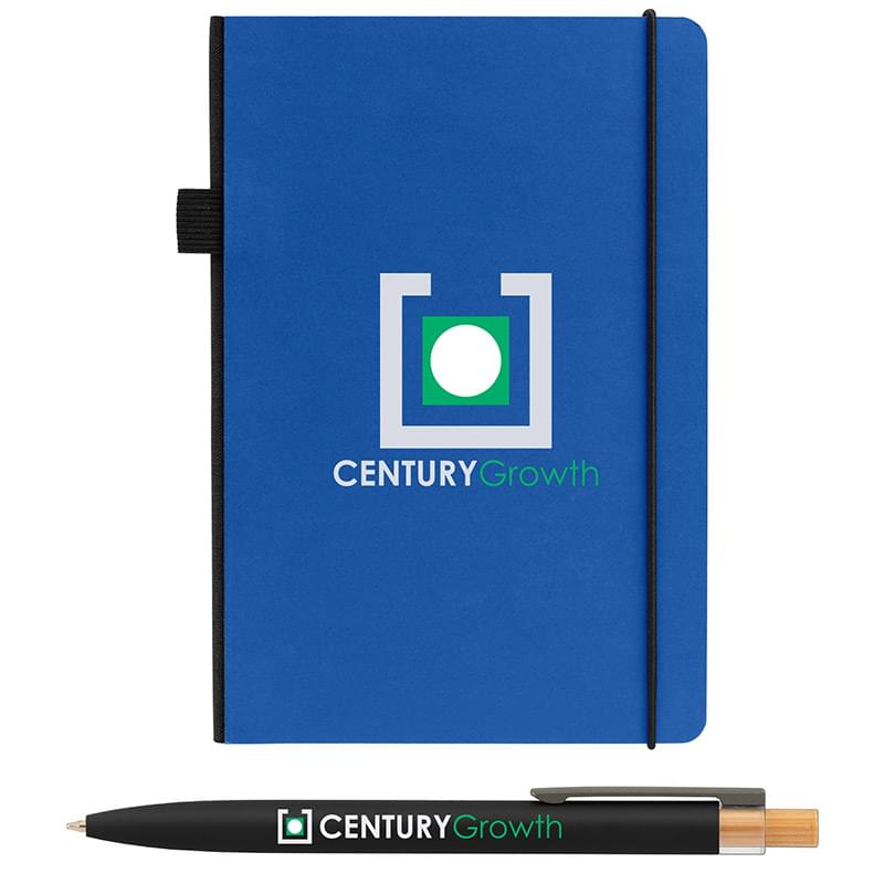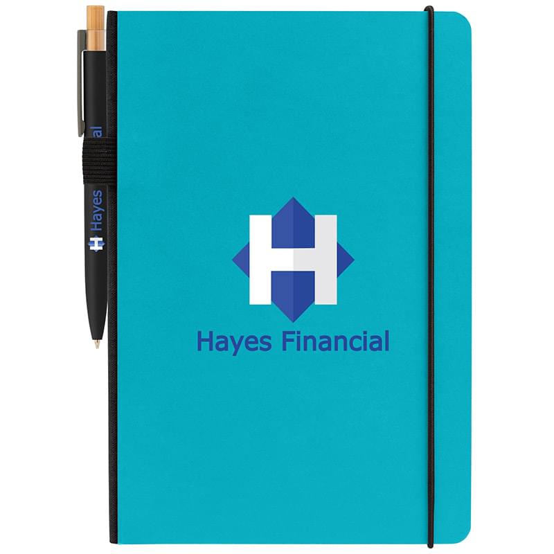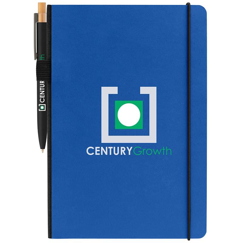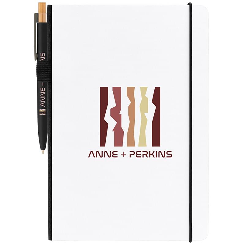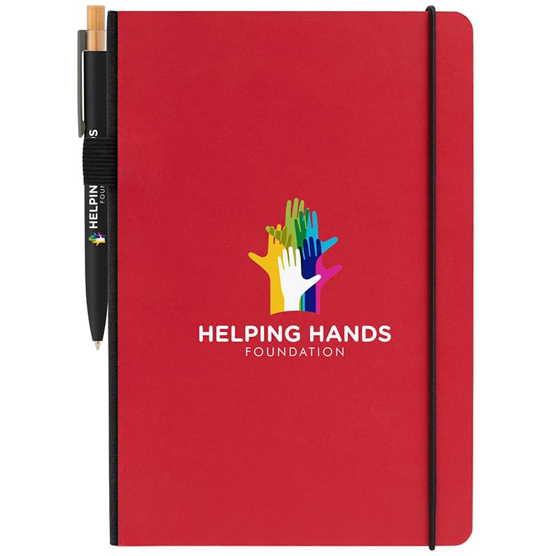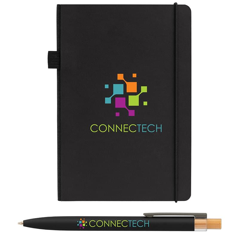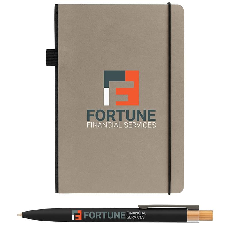 Introducing our Recycled Kraft Paper Cover Journal & Pen Set - A5 5.9" x 8.3" - perfect for individuals who appreciate quality and style. This set includes a journal and a pen designed for both functionality and elegance. The front cover of the journal is made from 2mm thick recycled kraft paper, while the back cover and spine are crafted from black RPET material. This journal features a black elastic pen loop on the spine and a black elastic strap with silver grommets for secure closure. Inside, you will find 80 sheets of 70gsm ivory-colored, college-lined paper sourced via responsible forestry. Complementing the journal is the MTR recycled aluminum pen with bamboo accents, available in black, to match all notebook colors. Show your brand's true colors with ColorJet, our full-color inkjet imprint process.