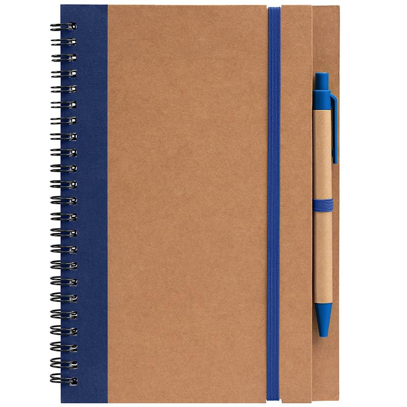 Discover the natural charm of our Kraft Hard Cover Spiral Notebook with Pen, designed for creativity and practicality. The journal features a front cover made from durable craft paper, accented with RPET fabric on the left side and a craft paper and RPET fabric stripe on the back. A color-matching elastic pen loop and strap, secured with a silver grommet on the back cover, ensure easy access and closure. Inside, you will find 70 sheets of responsibly sourced ivory paper with college lines, perfect for organized note-taking and creative expression. The black metal spiral binding adds durability and a sleek finish. The included pen features a craft paper barrel and retractable design, with ABS components (top, plunger, clip, tip) that match the fabric color on the cover for a cohesive look. Compact at 5.83" x 8.27" x 0.39", this journal and pen set combines functionality with materials inspired by nature, making it an ideal choice for professionals and creatives alike.