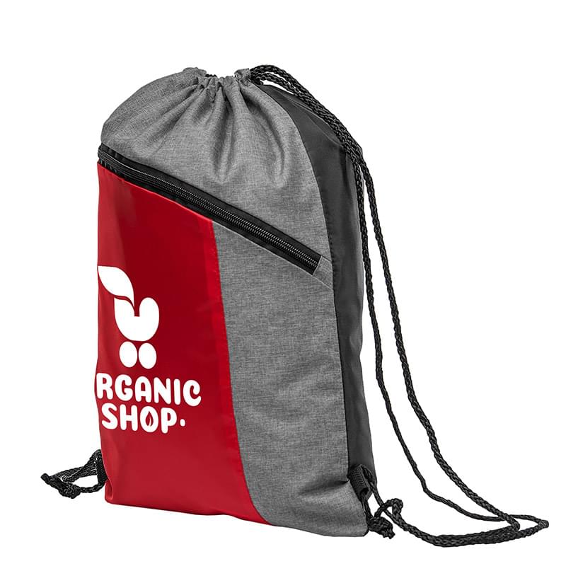 The Geneva Drawstring Backpack features stylish heathered gray 210D polyester, accented with a front panel in red or blue, where your logo will be imprinted in 1-color silkscreen. Featuring a front pocket with zipper, and main compartment with drawstring closure, the Geneva Backpack is both practical and attractive.