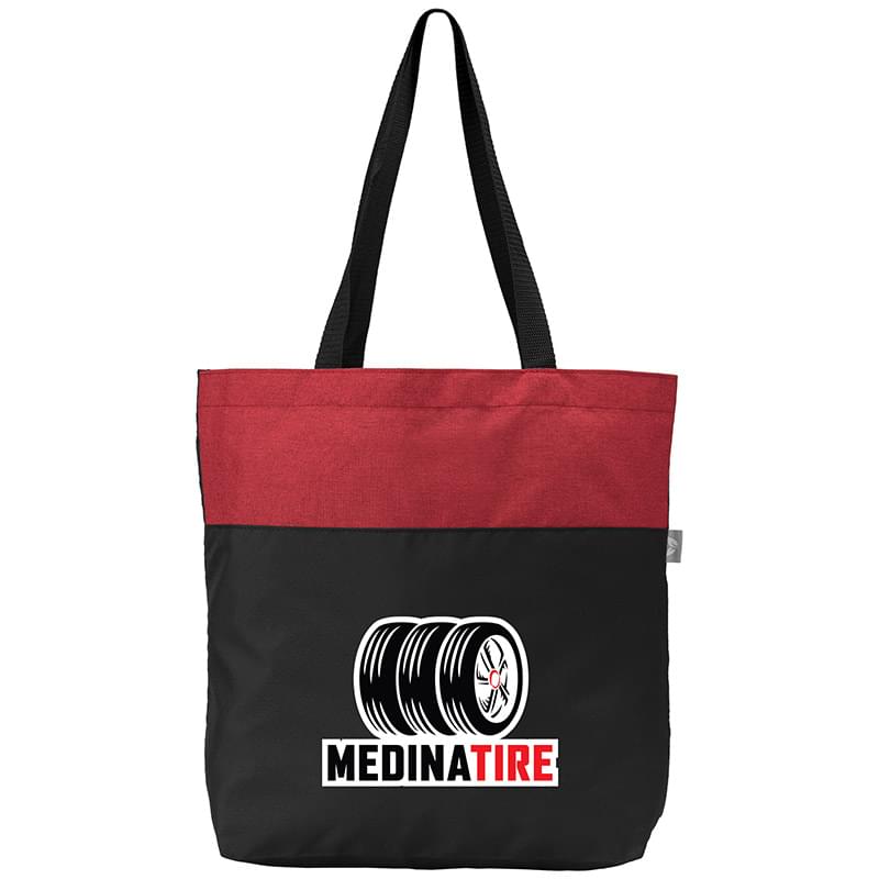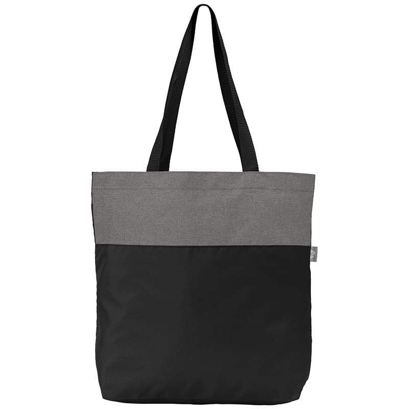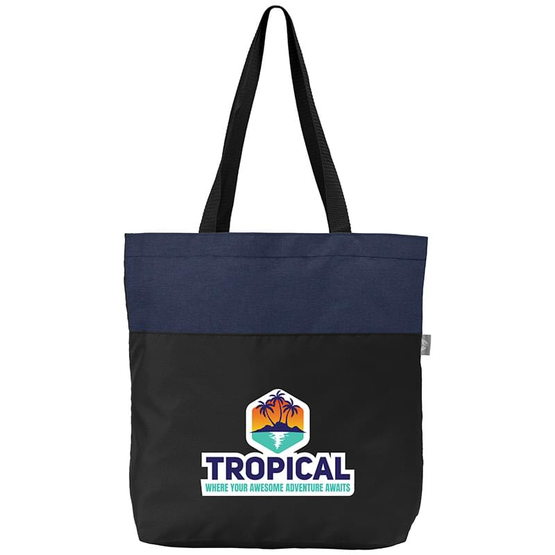 Introducing our Kingston RPET 300D Tote Bag - a stylish accessory for your everyday needs. The heathered color block design is complemented by the material, crafted from 100% 300D RPET polyester. The tote features long handles with a comfortable size of 25.98" ensuring easy carrying. Measuring 13.78" x 16.93" x 4.72" , it offers a spacious 10 L capacity, supporting a maximum weight of 5 kgs. An eco tag, made of Jacquard material, is sewn on the outside of the bag. The tag features a leaf design on one side and "recycled RPET" on the other, making this tote a mindful and chic choice. Your logo will be imprinted using our Full Color Heat Transfer technology.