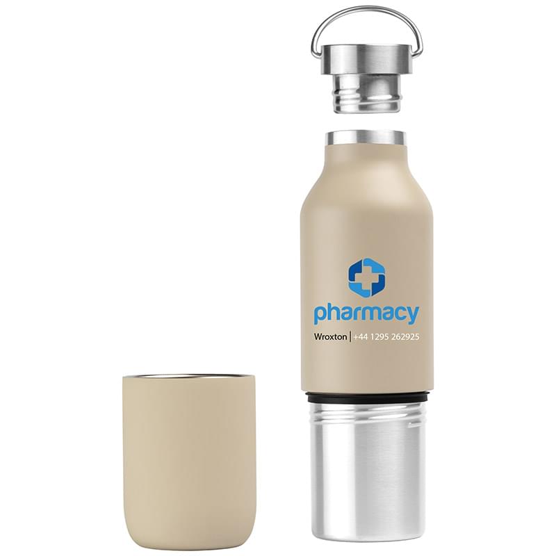 Introducing our Freya Duo – 2-in-1 20 oz. Double-Wall Recycled Stainless Steel Bottle with 11 oz. Tumbler, designed to revolutionize your beverage experience. Crafted from recycled 304 stainless steel, this product features vacuum insulation technology to keep your drinks at the ideal temperature for extended periods, it keeps hot drinks warm for up to 8 hours and cold drinks chilled for an impressive 24 hours. With a sizable 20 oz bottle capacity and an additional 11 oz tumbler capacity. The screw-on Leakproof lid ensures a tight seal, while the matte finish powder coating and rubber finish provide style and functionality. Designed with an ergonomic handle for on-the-go convenience, it's perfect for staying hydrated anywhere. Whether you're enjoying a hot coffee or a cool iced tea, this versatile bottle has you covered. Full Color decoration for your logo.