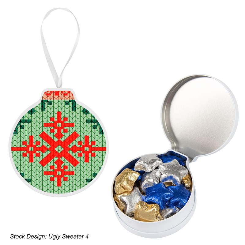 Full Color Ornament Tin With Hershey Kisses, Hershey Miniatures, Chocolate Stars, Starbursts