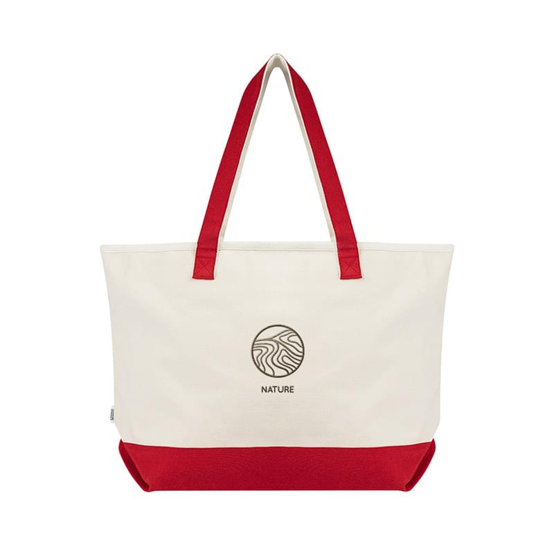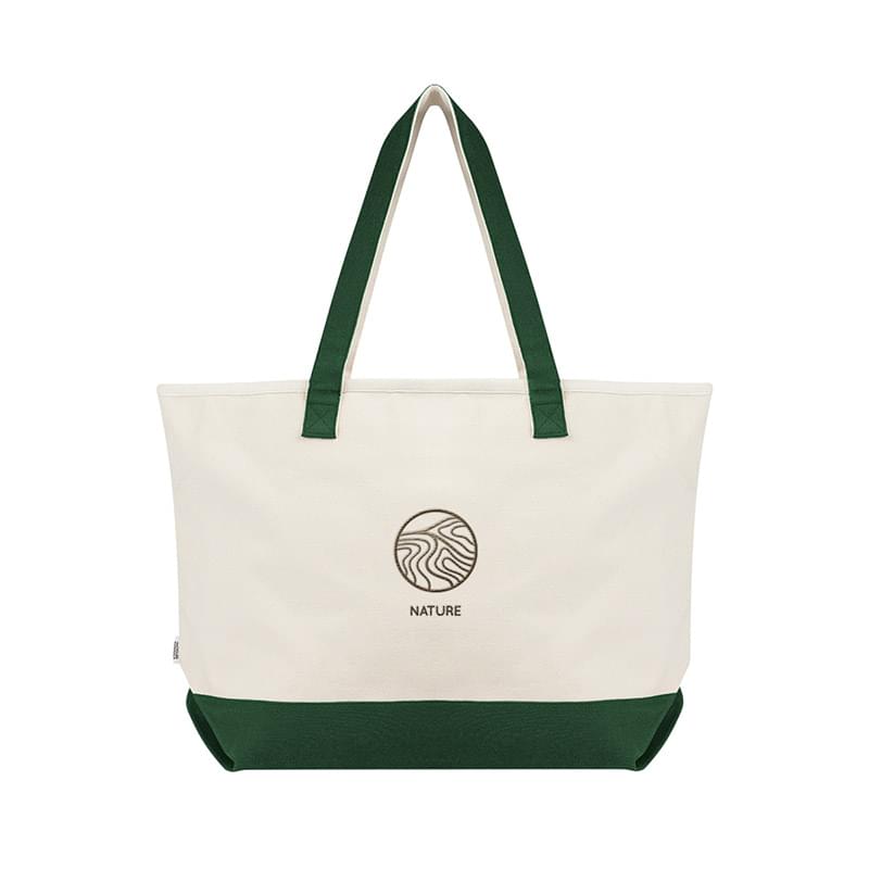 Made Of 19 Oz. Recycled Cotton Canvas | 600 GSM Recycled Canvas And 140 GSM Recycled Cotton | Zippered Main Compartment | 28" Handles | 4" Bottom Gusset | Spot Clean/Air Dry