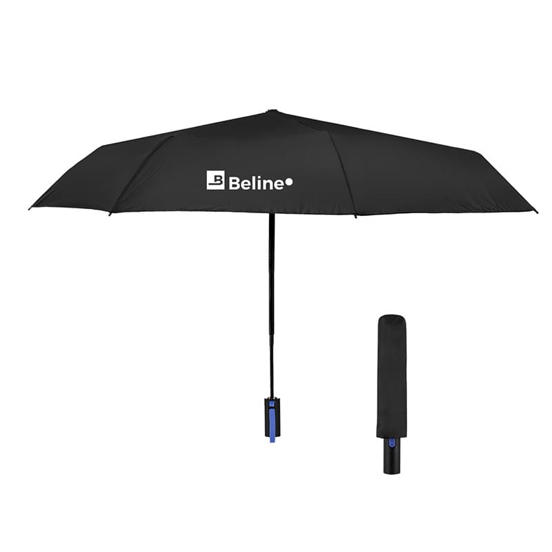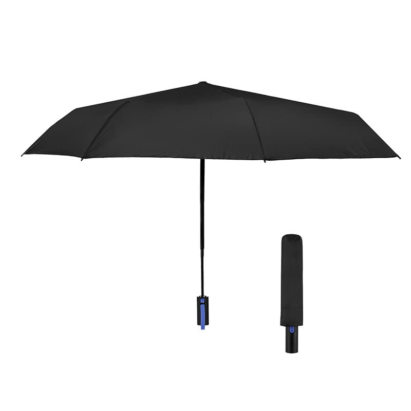 Auto Open & Close | Telescopic Folding Umbrella | 190T rPET With UV Coating | Made From Post Consumer Recycled Materials | Recycled Polyester (rPET) is Obtained By Melting Down Existing Plastic Bottles And Other Material Sources To Create New Polyester Fiber | Handle, Wrist Strap, Shaft, Ribs & Closure Are Not rPET | Iron Shaft | Black Glass Fiber U-Ribs | Bungee Wrist Strap For Hands-Free Use | Hook & Loop Closure | Matching Sleeve | 11 ¾" Closed