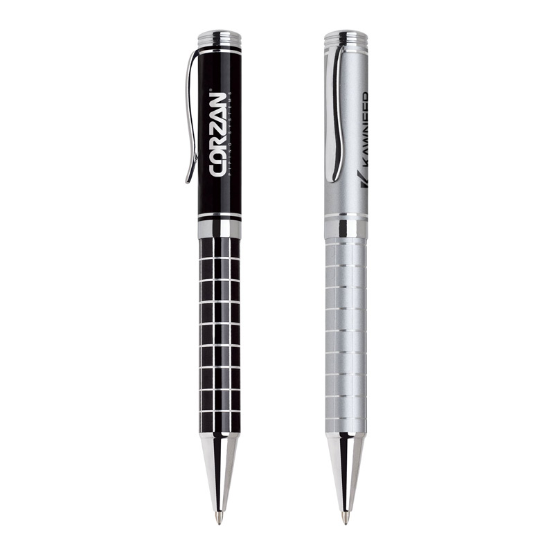 Sophisticated twist action ballpoint pen with refined grid barrel design and sleek chrome accents.