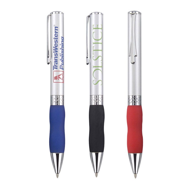 Twist action ballpoint pen with wide body and satin chrome finish, including an ultra soft grip and an elegant design clip.