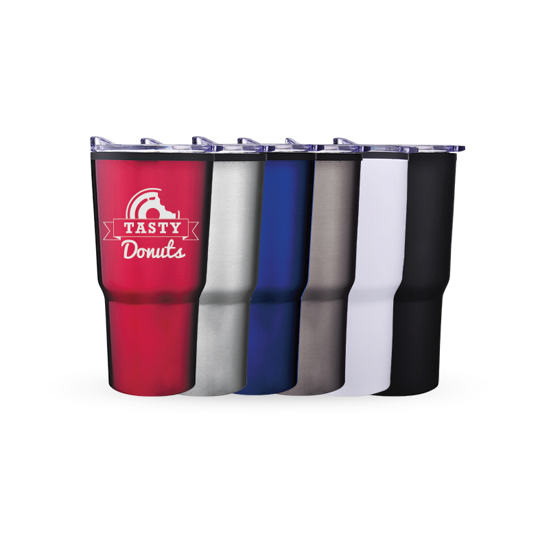 Jumbo 30 oz. stainless exterior and plastic interior; Keeps drinks hot or cold up to 4 hours; Off-set shape designed to fit cup holders; Spill-resistant slide action lid with rubber gasket; Meets FDA Requirements, BPA free